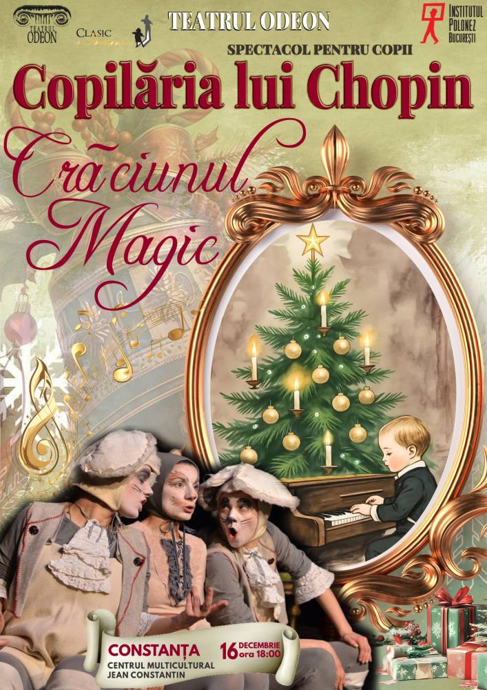 bilet onlineUnul din cele mai apreciate spectacole ale Teatrului Odeon, dedicat părinților și copiilor, se va juca pe scena Centrul Multifuncțional Educativ pentru Tineret “Jean Constantin” Constanța Frédéric Chopin este considerat astăzi cel mai mare muzician polonez şi unul dintre cei mai apreciaţi compozitori în întreaga lume. Ce fel de copil a fost renumitul compozitor și pianist polonez Frédéric Chopin? Cum a luat naștere muzica lui și oare de ce le place ea astăzi celor mai tineri? În atmosferă magică de Crăciun, personaje de basm le vor povesti copiilor despre toate acestea și despre multe altele. Năstrușnicii șoricei Sică și Rică, împreună cu Lola vor aduce mai aproape, lumea micului Frédéric. Cu mare bucurie, ei învață împreună cu cei mici, să danseze vals, pe muzica creată de extraordinar de talentatul tânăr polonez, să bată din palme pe ritmurile vesele, specifice de mazurcă sau poloneză. Este un spectacol interactiv, educativ, plin de momente haioase, îmbinând în cel mai frumos mod muzica, jocul de scenă, dansul și voia bună. Spectacolul face parte dintr-un ciclu educativ pentru copii, despre marii compozitori ai lumii: „Clasic e fantastic. Copilăria marilor muzicieni”. Spectacolele sunt interactive, publicul participa direct la momentele din spectacol, învață pași de dans, ritmuri specifice, se joaca cu actorii și muzicienii sau întra în dialog direct cu povestitorul/ entertainerul spectacolului Șoricelul Sol. DISTRIBUȚIE Actorii: MONICA CIUTĂ --- Lola SELINA COLCERU --- Rică VALERIA CRISTIA --- Frederik Chopin IOANA MIHALCEA --- Sică FILIP RISTOVSKI --- Giorgio ALEXANDRU UNGURU --- Sol Pianista: RALUCA OUATU