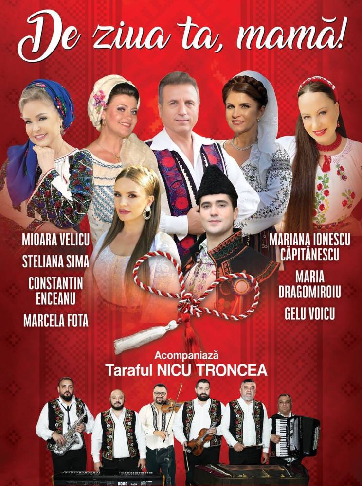 bilet onlineUn turneu național dedicat emoției, recunoștinței și celebrării femeii, mamei și tradițiilor românești. În perioada sfârșitului de februarie și începutului de martie 2026, unele dintre cele mai mari și iubite nume ale folclorului românesc pornesc într-un turneu de suflet ce va străbate România, aducând pe scenă cântece care au scris istorie și emoții care unesc generații. Steliana Sima, Constantin Enceanu, Mariana Ionescu Căpitănescu, Mioara Velicu, Maria Dragomiroiu, Marcela Fota și Gelu Voicu, artiști ale căror voci au devenit repere ale muzicii populare, se reunesc într-o distribuție rar întâlnită, oferind publicului o experiență autentică, caldă și memorabilă. Acompaniați de Taraful NICU TRONCEA, fiecare moment prinde viață prin orchestră live, rând pe rând ridicând sala într-un spectacol care omagiază frumusețea folclorului și puterea sentimentală a cântecului românesc. Turneul „De ziua ta, mamă!” își propune să readucă în prim-plan respectul, iubirea și apropierea față de cele care ne-au crescut și ne-au învățat ce înseamnă bunătatea. Este o invitație la celebrarea primăverii cu emoție curată, un prilej de a oferi mamelor și femeilor importante din viața noastră un cadou care nu se uită: o seară de muzică aleasă, tradiție și bucurie, o întâlnire cu tradiția, cu recunoștința și cu frumusețea culturii românești. O experiență ce rămâne în memorie ca o primăvară care începe în inimă și continuă în aplauzele sălilor pline de emoție. Un spectacol grandios, cu artiști legendari, povești cântate și o atmosferă românească în cea mai frumoasă formă a ei. Invitati: Mioara Velicu, Steliana Sima, Constantin Enceanu, Marcela Fota, Mariana Ionescu Capitanescu, Maria Dragomiroiu, Gelu Voicu. Acompaniaza Taraful NICU TRONCEA Pentru detalii suplimentare in legatura cu evenimentul de mai sus va rugam sa contactati firma organizatoare: Magic Moments SHOW SRL , CIF 46571900, BUCURESTI