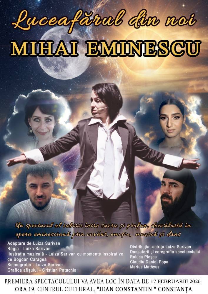 Sunt actrița Luiza Sarivan din Constanța și am onoarea și bucuria de a dărui publicului constănțean, un spectacol plin de sensibilitate "Luceafarul din noi " pe 17 februarie 2026. Acest spectacol unic prin conținut, expresie și transfigurare scenică, este dedicat poetului nepereche Mihai Eminescu de la nașterea căruia se vor împlini 176 de ani. În 2015, pe 1 Decembrie acest spectacol a fost prezentat în premieră pe scena Teatrului de Stat Constanța și s-a bucurat de un mare succes în rândul tinerilor, dar și a adulților. În 2026 mi-am propus să readuc în lumina reflectoarelor " Luceafarul din noi " pe scena Tomitană, iar apoi și în țară, în cadrul unui proiect cultural. Va voi dezvalui cateva detalii ale acestei productii. Eu,Luiza Sarivan, Impreuna cu dansatorii profesionisti formam un tot care pulseaza prin muzica poeziei si prozei eminesciene, atingand spatiul, timpul si spiritul in dantelaria spectacolului. Planul cuvantului se impleteste cu planul dansului, manifestand iubirea intre sacru si profan din opera eminesciana, dand-o spre respiratie spectatorului. Se deschide o lume pentru lume catre lume asa cu Eminescu a trait-o visand iluminarea ei. Prin momentul spectacolului lasam sufletul sa ne vorbeasca. Teatrul reuseste cu gratia sa sa atinga omul prin reciprocitatea actului de primire-daruire. Este legatura miraculoasa pe care teatrul o creaza acum-aici ramanand mai apoi samanta din boarea mesajului scenic. Acest spectacol exprima efemerul.Exprima tot ce omul traieste in aceasta viata si poate nu-si da seama cat de bogat este in sufletul lui. Va daruiesc, voua, adolescentilor si adultilor acest spectacol ca pe o fereastra deschisa a mintii si sufletului catre cultura, iubire, spirit si Divin.