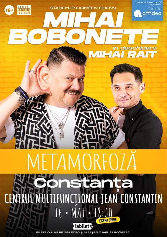 În noul spectacol de stand-up comedy, Metamorfoză, Mihai Bobonete vorbește despre schimbările prin care a trecut în ultima vreme și despre cum le face față în stilul său inconfundabil. Cu umorul său natural și autoironia caracteristică, Bobonete reușește să transforme provocările vieții în povești savuroase, pline de haz. Ca și anul trecut, spectacolul va fi deschis de prietenul și colegul său de scenă, Mihai Rait, pregătind perfect atmosfera pentru o seară de râs pe săturate. Regulament de participare: - Biletul este valabil imprimat alb-negru sau color sau prin scanarea codului QR pe telefon. - Filmarea spectacolului este strict interzis! Filmarea neautorizată reprezintă o încălcare a legilor aplicabile. - Pe toata durata spectacolului va rugam sa nu folositi telefoanele mobile si sa le utilizati pe modul vibratii/silentios. !! Spectacolul este interzis minorilor sub 16 ani. Dupa inceperea spectacolului locurile afisate pe bilet nu mai pot fi garantate. Va rugam sa veniti din timp la spectacol pentru a nu deranja ceilalti spectatori. Din motive independente de vointa noastra, anumite detalii legate de eveniment pot suferi modificari (ora, locatia). Va vom anunta de fiecare data cand acest lucru se intampla si va multumim pentru intelegere. Ne rezervam dreptul de a nu permite accesul in sala al participantilor la eveniment ce se afla in stare de ebrietate sau au o conduita ce poate perturba desfasurarea evenimentului. Prin achizitionarea biletelor, cumparatorul a luat cunostinta de aceste reguli şi implicit de respectarea lor.