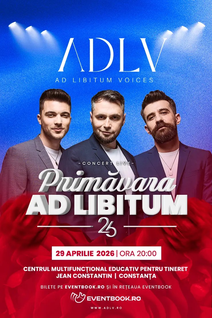 Ad Libitum Voices urcă pe scena Centrului Multifuncțional Educativ pentru Tineret Jean Constantin din Constanța, pe 29 aprilie 2026, cu un concert dedicat iubirii, primăverii și emoției autentice. Ajuns la al treilea turneu de primăvară, spectacolul „Primăvara Ad Libitum” marchează extinderea turneelor organizate de echipa Ad Libitum Voices, într-un an în care proiectul va ajunge în mult mai multe orașe din România. Romantismul care i-a consacrat ca cel mai viral grup vocal din Europa de Sud-Est se regăsește din plin în acest concert special. Piese legendare precum „Il Mondo”, “Volare”, sau „Vivo per Lei” sunt reinterpretate într-o manieră unică, inconfundabilă Ad Libitum Voices, într-o seară plină de eleganță, energie și nostalgie. Biletele VIP – Meet the Talent, cu acces backstage după concert și experiențe foto & video exclusive, sunt în număr limitat. Acces: 19:15 | Show: 20:00